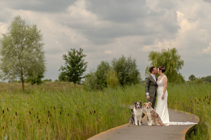 Als eerste hebben wij foto's gemaakt samen met de honden in het nabijgelegen park voordat we naar de trouwlocatie reden. Bij aankomst van de trouwlocatie nog prachtige foto's van hun samen gemaakt met de Volkswagen bus. Terwijl wij bezig waren met het maken van adembenemende foto's, verzamelden de gasten rustig om vervolgens plaats te nemen voor de ceremonie. Na de fotoshoot zaten alle gasten klaar en waren Mandy & Nicky er helemaal klaar voor.