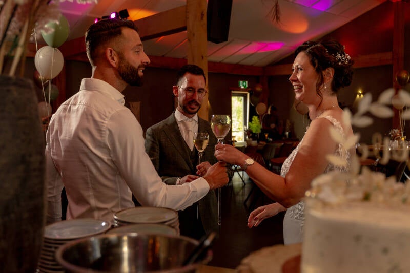 Tijdens de ceremonie werd alles klaargemaakt voor het moment van de taart, waarna er meteen geproost kon worden. Mandy & Nicky kwamen vol enthousiasme naar voren en kregen bubbels aangeboden. Eerst werd er getoast met de bubbels, gevolgd door het aansnijden van de taart, waarbij ze elkaar traditiegetrouw een hapje aanboden.